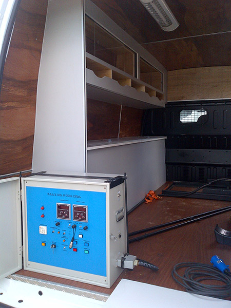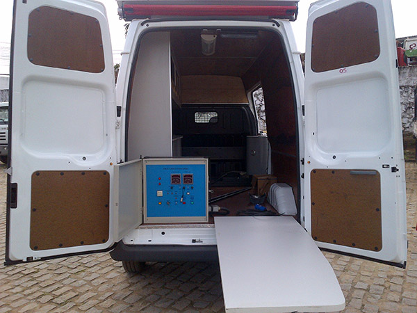 O Laboratório móvel é equipado com testador composto por modulo de controle e alta tensão, alimentado em 220VCZ e saídas de 60KVca/100mA e 120 KVca/50mA, preparado para realizar ensaios elétricos de tensão aplicado em corrente alternada na freqüência de 60Hz.